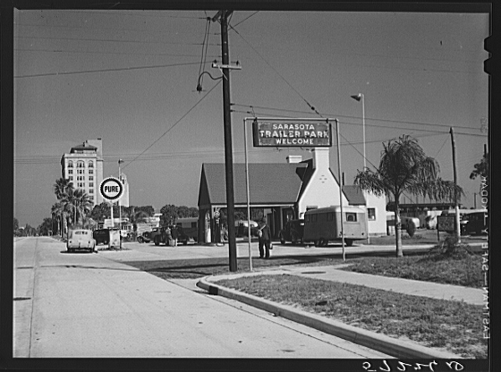 The Sarasota Trailer Park in January of 1941 was a vibrant place, having gained popularity in the 1930’s with members of the Tin Can Tourists (TCT); the trailer park hosted the group’s 1938 international convention. Even with the rest of the nation still struggling through the Great Depression, Sarasota was able to attract 3,000 tourists who were willing and able to spend money and stimulate the local economy. At the trailer park in 1941, the seasonal residents were enjoying their reprieve from the northern winters by participating in dances, parties, trailer park band concerts, organized bicycle rides, and various club meetings. There was even an amateur camera contest to produce a photograph for a national trailer travel magazine. The park boasted that it was the world’s largest.