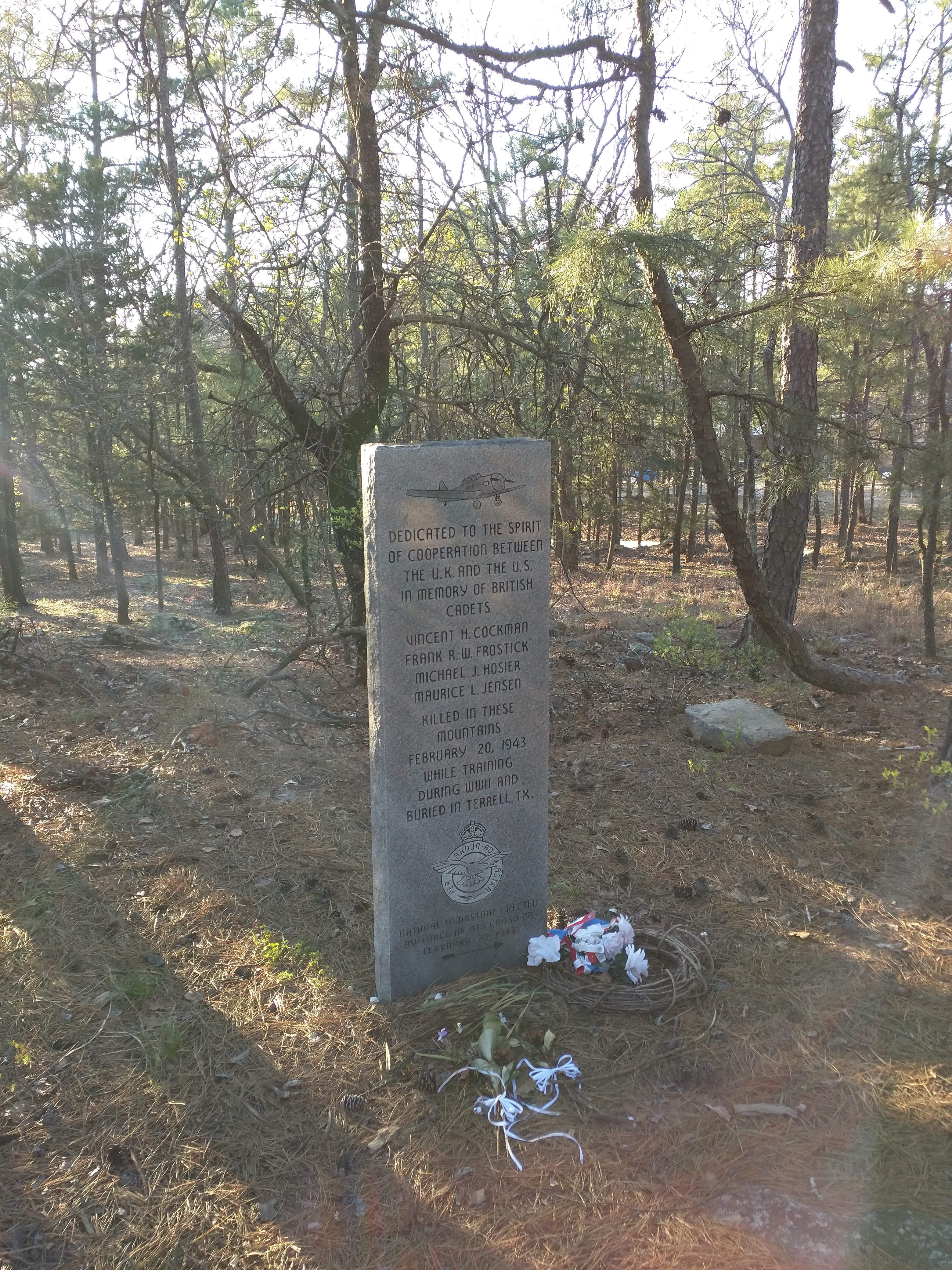 The morning of Saturday, February 20, 1943, Course 12 of the #1 British Flying Training School left Terrell, Texas, in a low level, cross-country training flight. Their destination was the #3 BFTS in Miami, Oklahoma. These AT6s encountered bad weather near Red River, the boundary between Texas and Oklahoma. Some planes returned to Terrell, some continued to Miami, but three were reported missing. According to the information gathered by Rattan Elementary students, one AT6 “belly landed” and slid into a tree. Pilot, Vincent Henry Cockman, and navigator, Frank R. Frostick, were found still in the cockpit. The Anderson-Clayton Funeral Home in Antlers, Oklahoma, picked up their bodies. The bodies were then transported to Terrell, Texas, for burial on Monday, February 22, 1943, at Oakland Cemetery. The AT6 flown by Michael John Minty Hosier with navigator Maurice Leslie Jensen nose-dived into the ground turning up a boulder, which created what community members refer to as a “natural tombstone.” The bodies of the two cadets were recovered on that (same) Monday and taken to the funeral home in Antlers. They were (also) returned to Terrell for burial. The third AT6 was able to land safely in a field and was flown back to Terrell the following day. The navigator of this plane, Gordon “Wilbur” Wright returned to Terrell in the AT6 while its pilot, John Wall, stayed to search for the two crashed AT6s. Wall wrote a letter describing this incident. The letter is included in the research report available at the Pushmataha County Historical Society in Antlers, Oklahoma, and at the Oklahoma Historical Society in Oklahoma City, Oklahoma. This monument was placed at the “natural tombstone” crash site for two principal reasons. The research brought about student awareness of the importance of maintaining good relations between the United States and the United Kingdom. The research also served as a reminder of the great sacrifices both countries have made to preserve and protect our freedom. This monument was placed in honor of these four cadets as well as all others who have given their lives for the cause of freedom. The monument was designed by the student researchers in consultation with the Canadian Commonwealth War Graves Commission and prepared by a local artisan, Mr. Allen Parsons of Allen’s Monuments. The monument was dedicated on Sunday, February 20, 2000, at 2:00 pm on the 57th anniversary of the crashes.