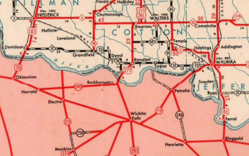 This map was created prior to the designations of U.S. Highways 277 and 281, and predates the designation of Interstate 44 on the H.E. Bailey Turnpike by 55 years. On March 3, 1945, the route of U.S. Highway 70 from Randlett was realigned to follow Oklahoma Highway 32 west to Davidson, Oklahoma, before turning south with U.S. Highway 183 to Oklaunion, Texas. U.S. Highway 277 still followed the previous route to Burkburnett.