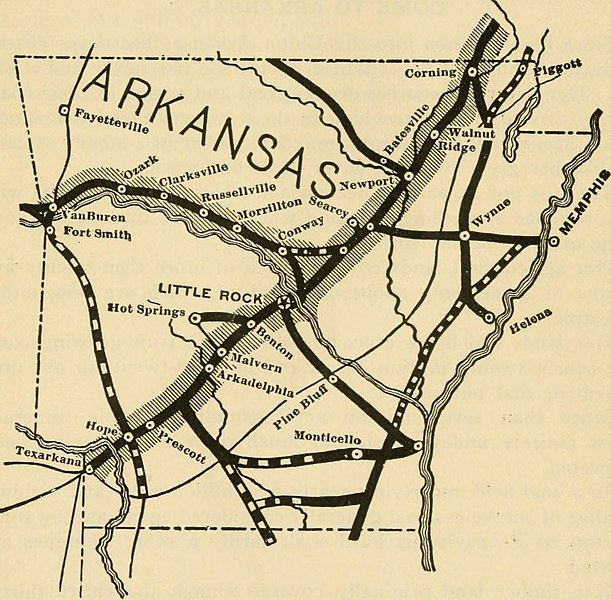 This travel route explores U.S. Highway 64 westbound outside Clarksville, Arkansas, to Ozark. For much of this route, the highway roughly parallels the Little Rock & Fort Smith Railway along the north side of the Arkansas River through west central Arkansas.