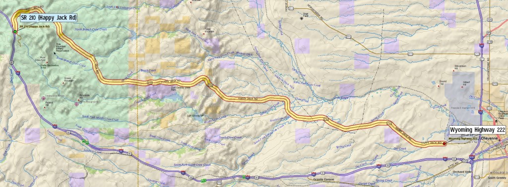 The Happy Jack Road (Wyoming Highway 210) is an alternate route between Laramie and Cheyenne. The road was named for ‘Happy Jack’ Hollingsworth, who took up a ranch near the foothills of the Laramie Range in 1884. The route follows Highway 210 east, down from The Summit and past the Sherman Mountains onto the plain west of Cheyenne.