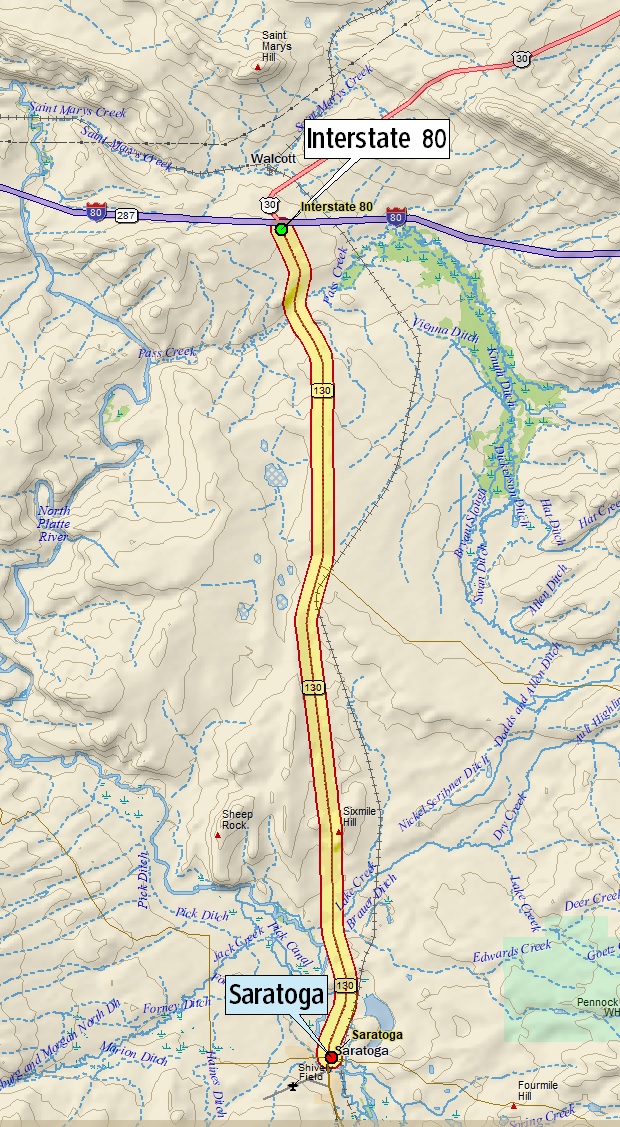 This travel route explores the northern half of the Saratoga-Encampment Valley, starting at Interstate 80 outside of Walcott. The route parallels the path of the Saratoga & Encampment Railway.