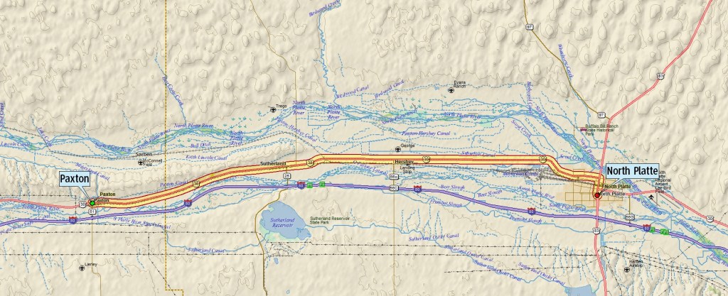 The travel route explores a path followed by many explorers and settlers from Paxton to North Platte, Nebraska. The route was explored by the Long-Bell Expedition in 1820 and by Captain James Fremont in 1846. The Oregon and Mormon Trails soon followed along the Platte River, branching at the present city of North Platte to follow the North or South forks. Travel continued with the Pony Express, Union Pacific Railroad, Lincoln Highway, and present U.S. Highway 30.
