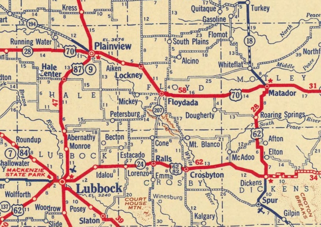 This travel route is based on the F.F.F. Highway, which stood for Ft. Worth-Farwell-Frisco. It explores the Caprock escarpment from Matador on to the Llano Estacado.
