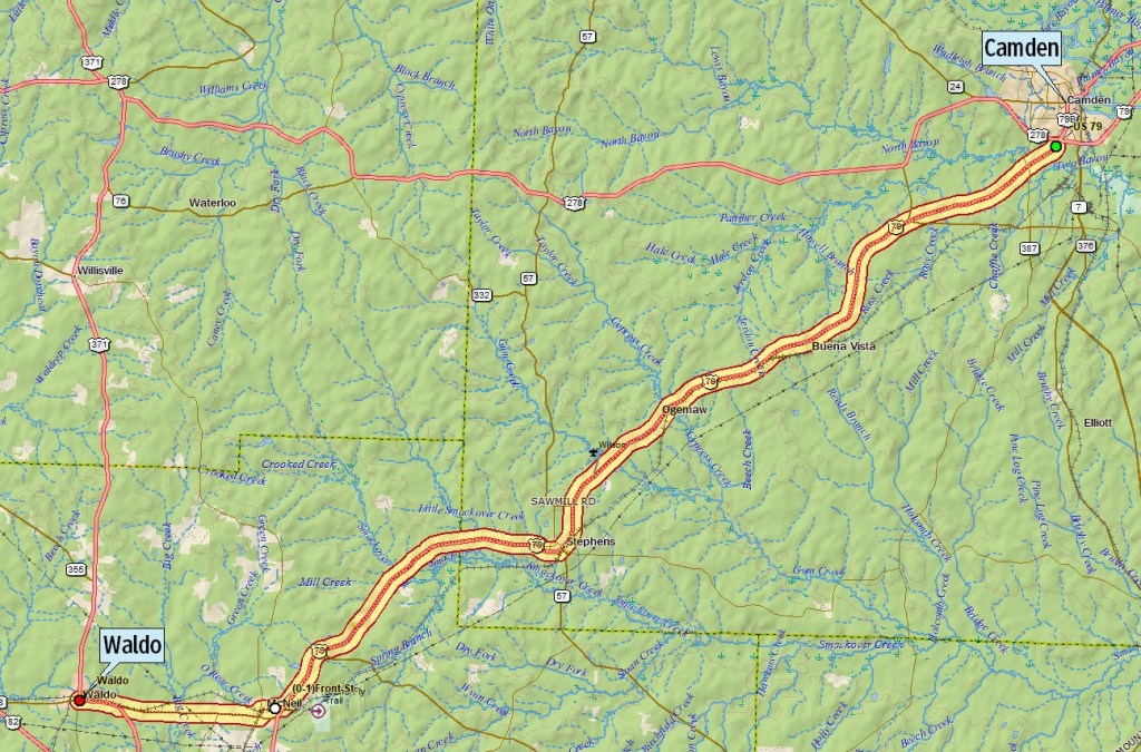 This travel route explores the former route of the Texas & St. Louis Railway (the Cotton Belt Route) along U.S. Highway 79 from Camden to Waldo, Arkansas.