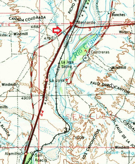 The USGS 1954 Socorro Map shows the crossing west of the newer Interstate 25.