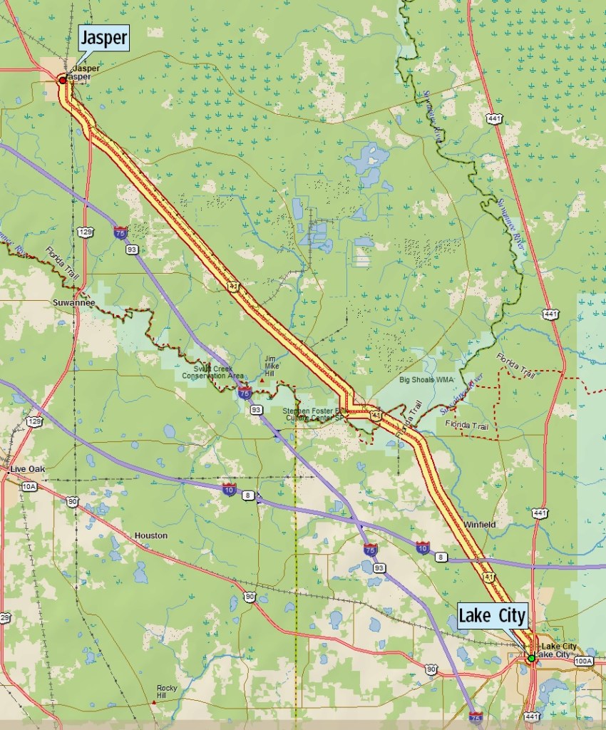 This travel route follows the previous path of the Central Florida Highway, now U.S. Highway 41, through a relatively thinly populated section of north Florida. The route begins in Lake City, traveling north through White Springs and on to Jasper.