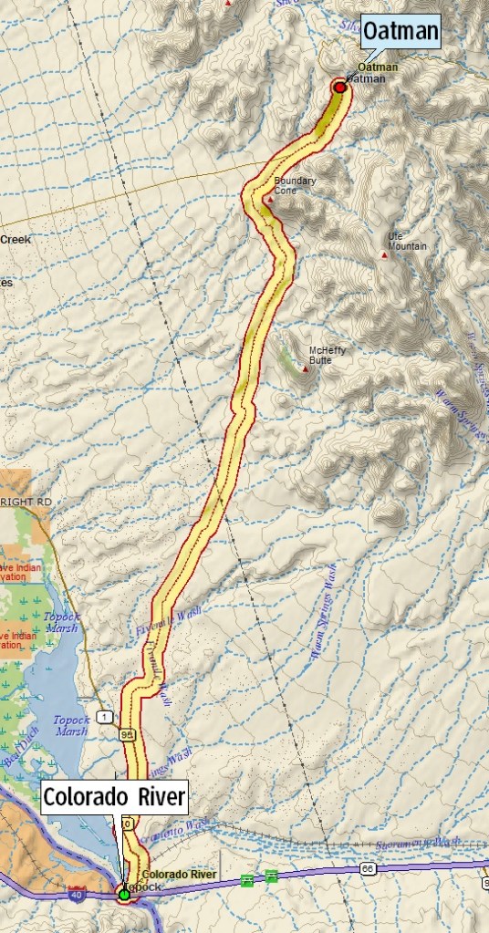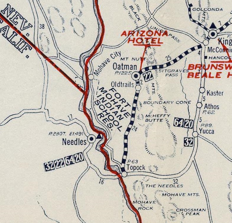 This travel route explores the National Old Trails Road auto trail and later U.S. Highway 66 from Topock to Oatman, Arizona.