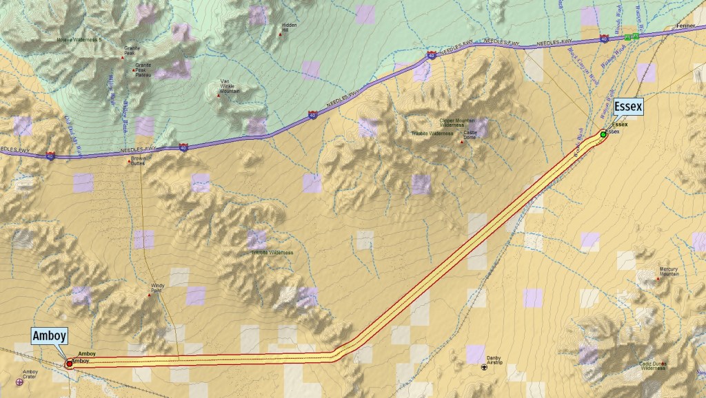 The route travels southwest from Essex through the desert floor of the Fenner Valley, roughly parallel to the tracks of the Atchison, Topeka & Santa Fe Railroad.