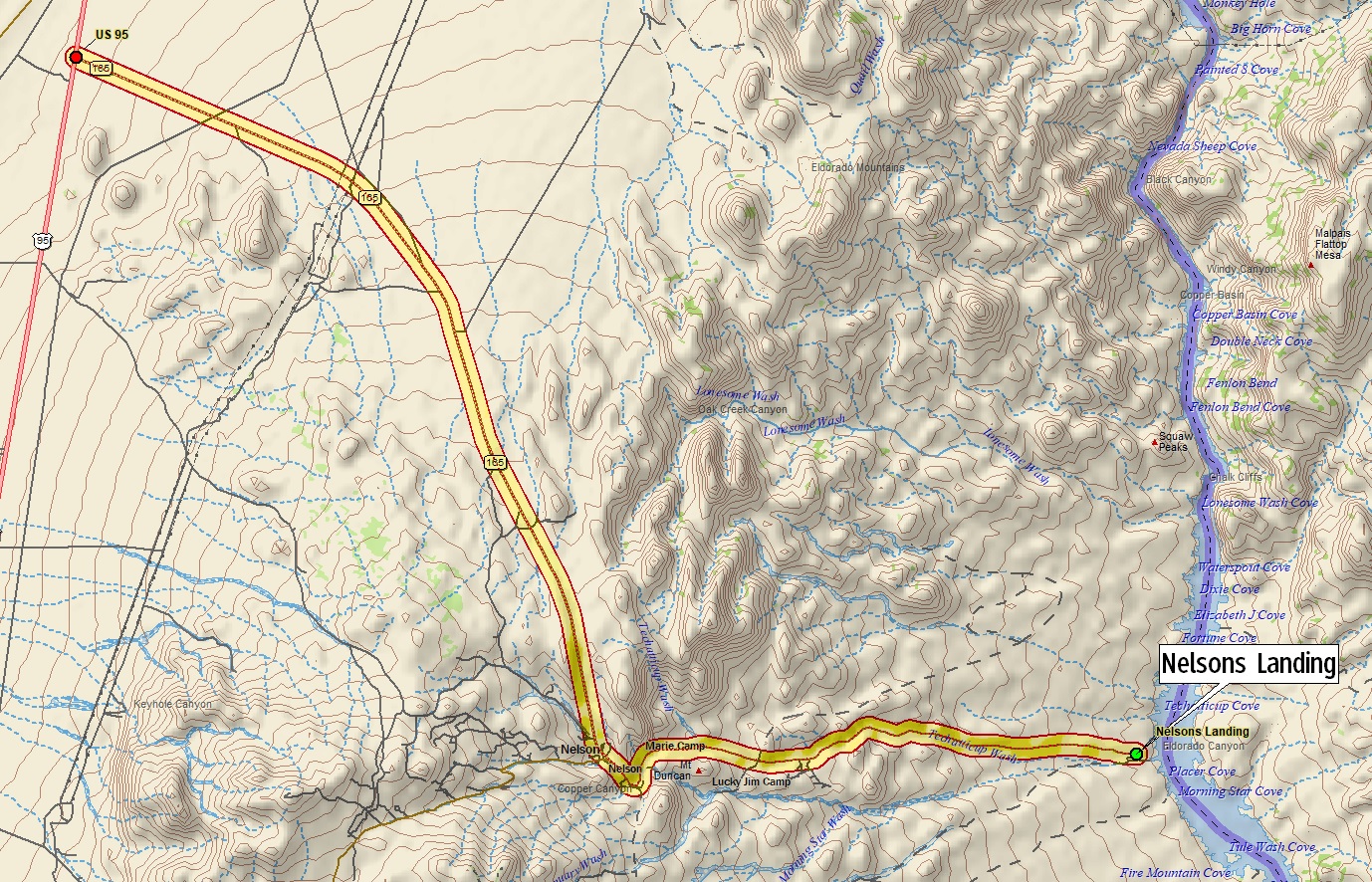 It follows the road from Nelsons Landing on the Colorado River to Nelson, where Nevada Highway 165 begins and crosses into the El Dorado Valley to U.S. Highway 95.