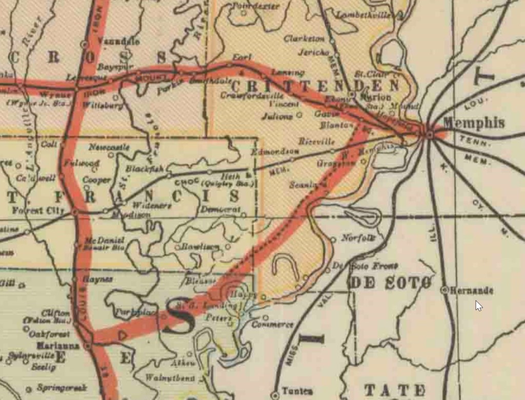 This travel route explores the route of the St. Louis, Iron Mountain & Southern Railway from Chatsfield to Marianna, Arkansas. It follows U.S. Highway 79 across the flats of the Arkansas Delta.
