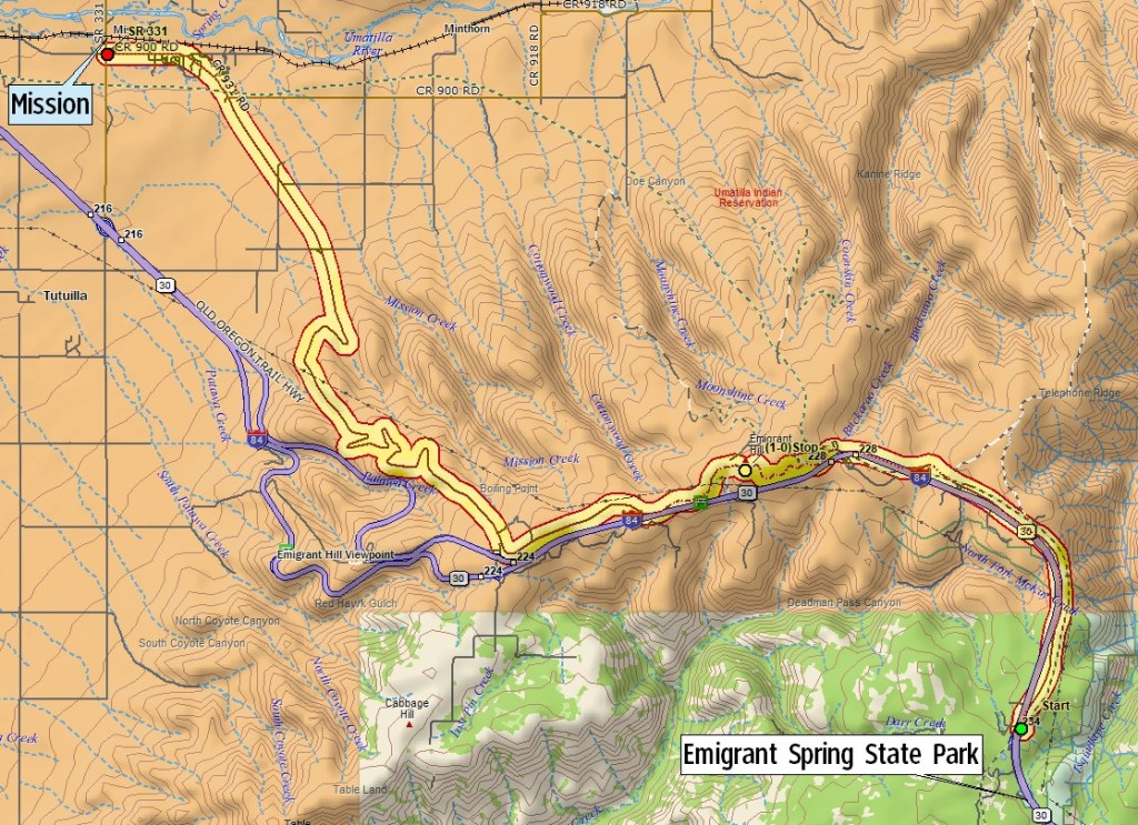 This driving video explores the route of the 1920s Oregon Trail auto trail from Emigrant Springs State Park to Mission, Oregon. The route passes Emigrant Hill and the Boiling Point before providing a winter vista over the Umatilla River valley.
