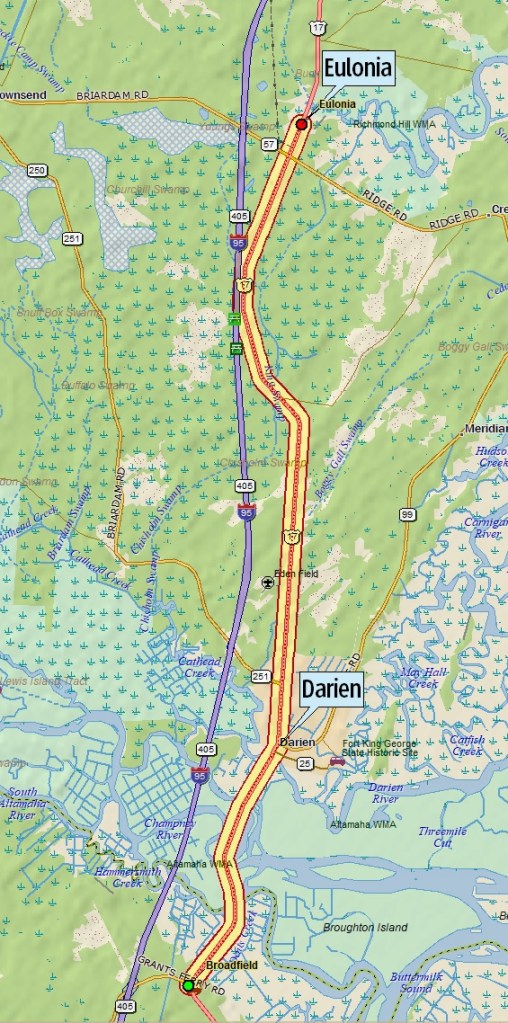The route starts at the crossroads of Broadfield and travels through Darien to Eulonia.