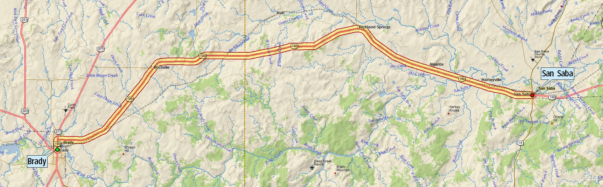 This travel route follows the tracks of an extension of the Gulf, Colorado & Santa Fe Railway from Brady to San Saba, Texas.