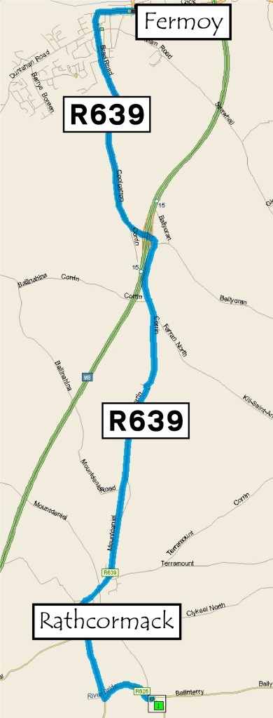 The route travels through Rathcormack, then north on the R639 to Fermoy.