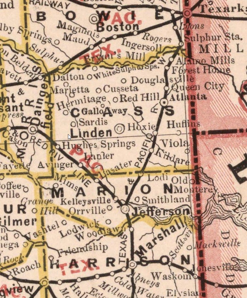 This travel route explores two sections of the Texas & Pacific Railway from Atlanta to Jefferson, Texas.