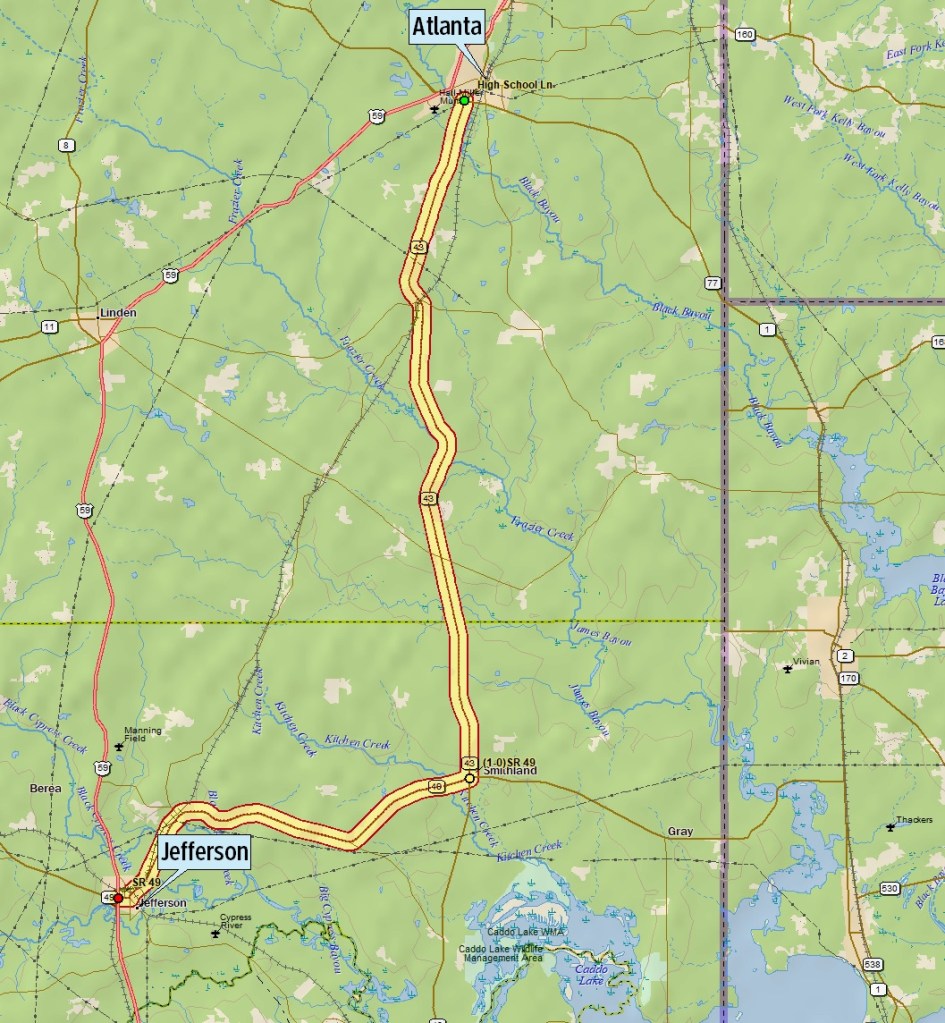 In between, the route passes through a more remote section of Cass County in Texas’ Piney Woods region.