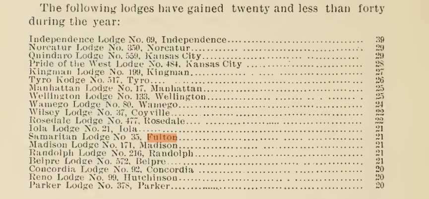 The Proceedings of the Fifth-First Annual Session of the Grand Lodge I.O.O.F. of Kansas from 1908 indicates this lodge added 21 members that year.