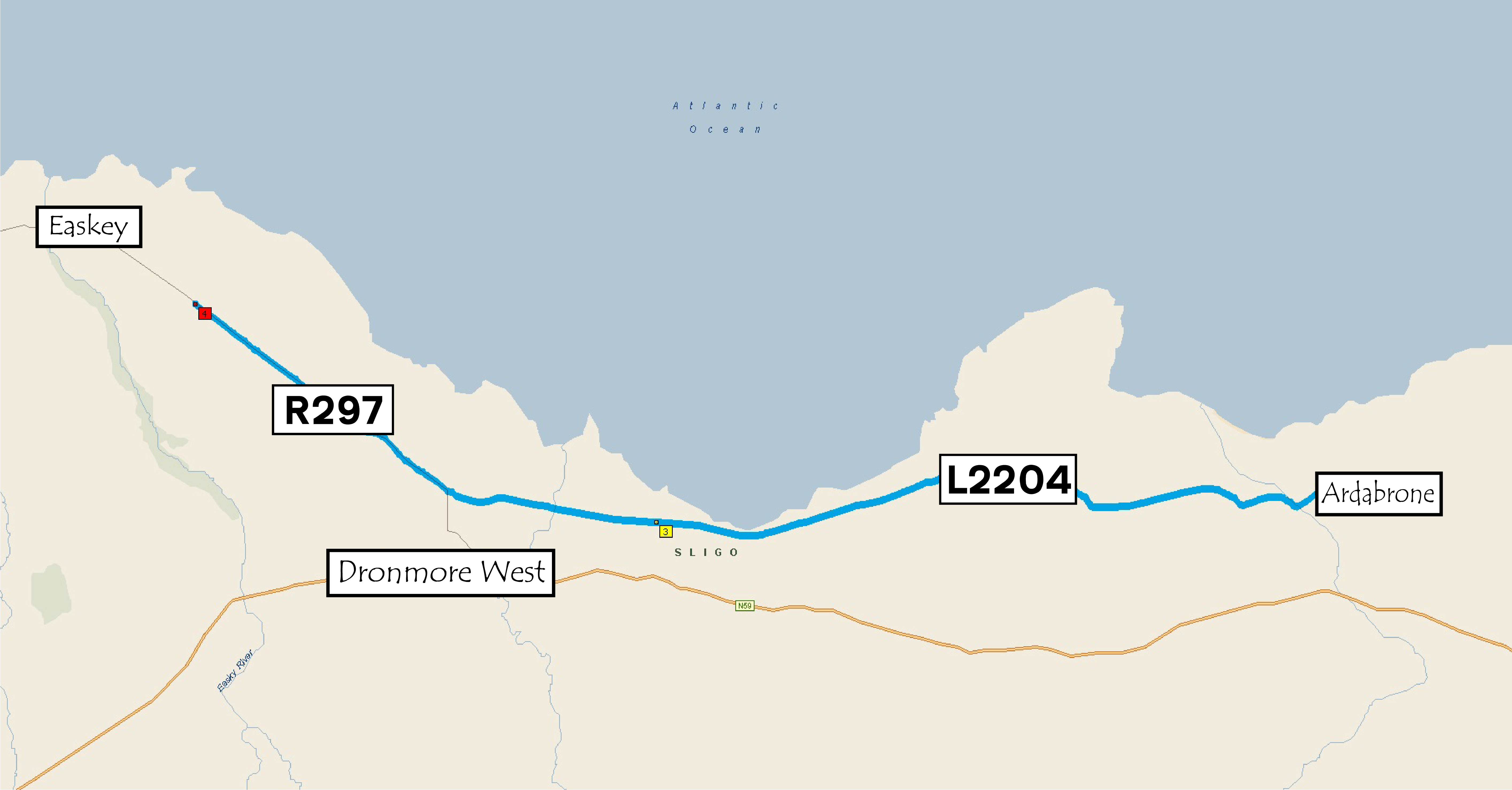 It follows the L2204 Coast Road and the R297 to Easkey through County Sligo.