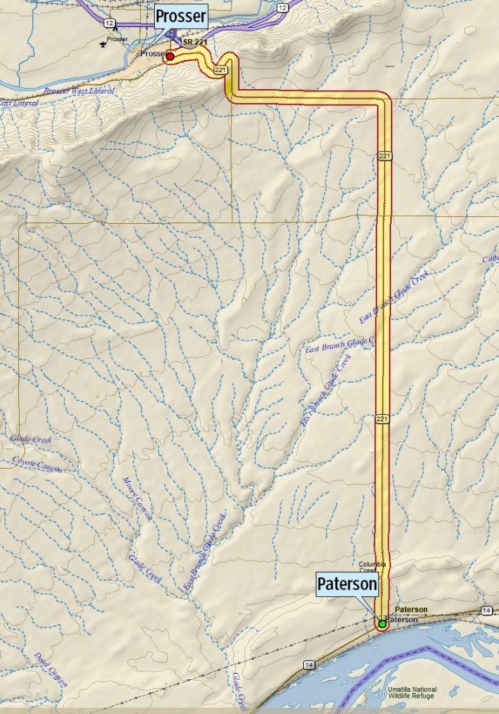 This travel route begins at Paterson on the Columbia River, crossing up and over the Horse Heaven Hills to Prosser on the Yakima River.