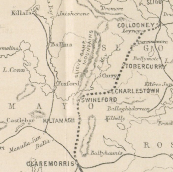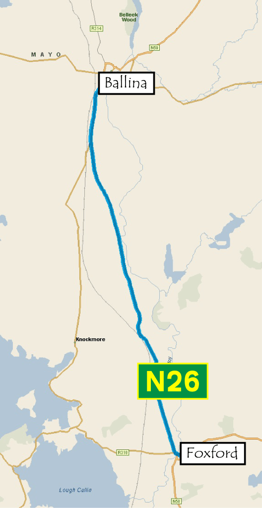This auto trail follows the N26 south from Ballina to Foxford in County Mayo.