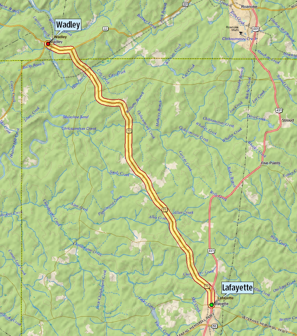 The auto trail explores a route dating back to the 1830s from Lafayette to Wadley, currently designated as Alabama State Highway 77.