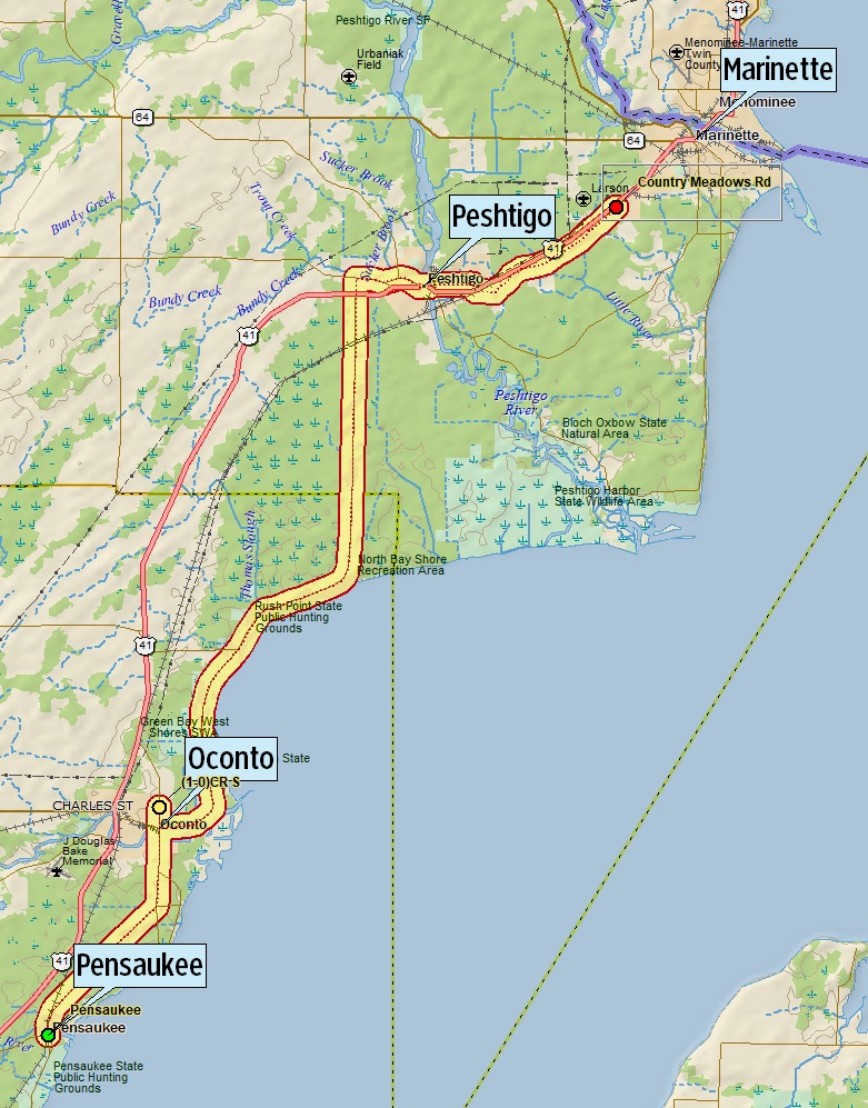 This American auto trail begins in Pensaukee, Wisconsin, and ends at Marinette, roughly following the route of the Chicago & North Western Railroad.