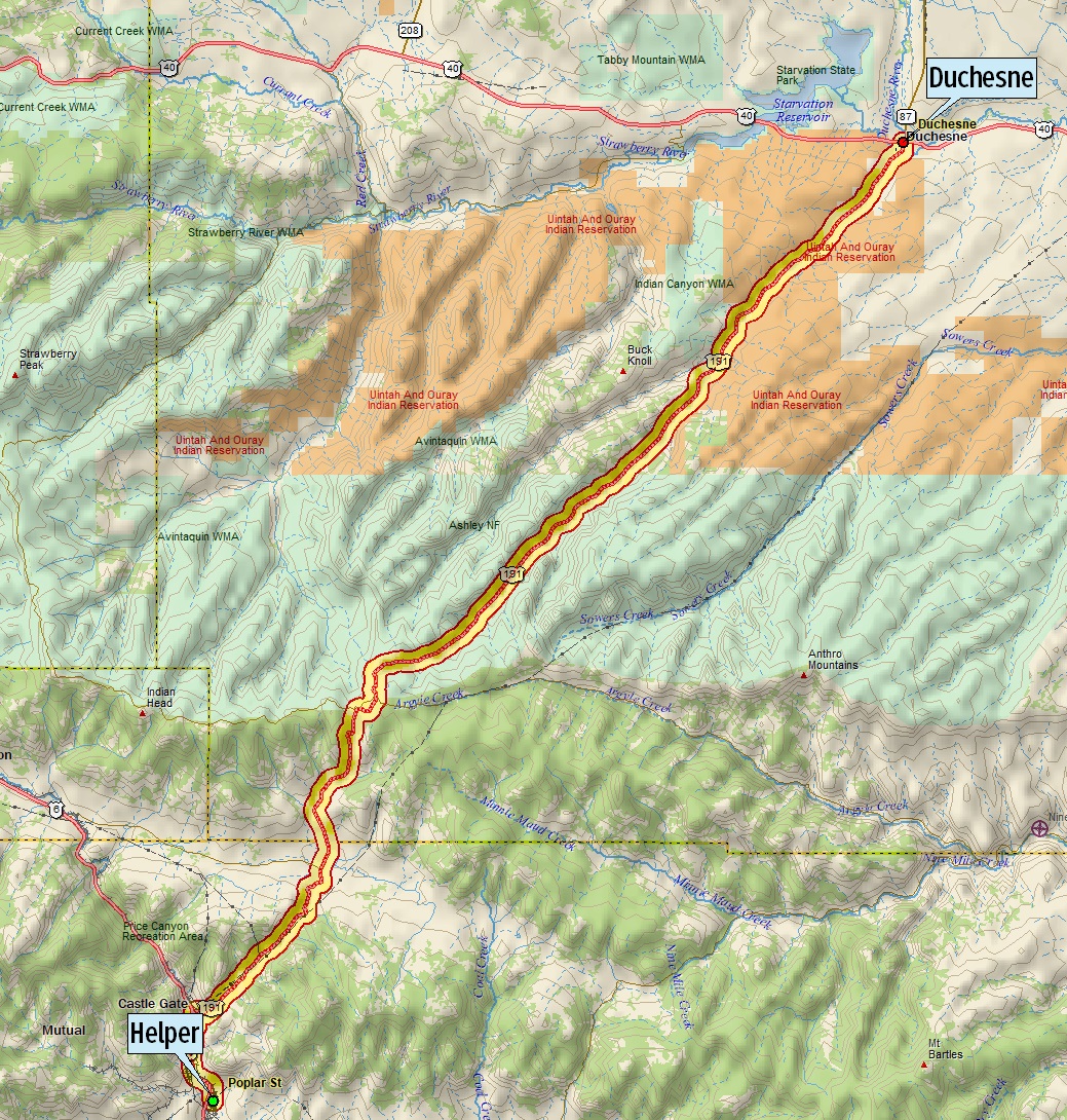 This auto trail explores U.S. Highway 191 from Helper, through Castle Gate, to Duchesne, Utah.