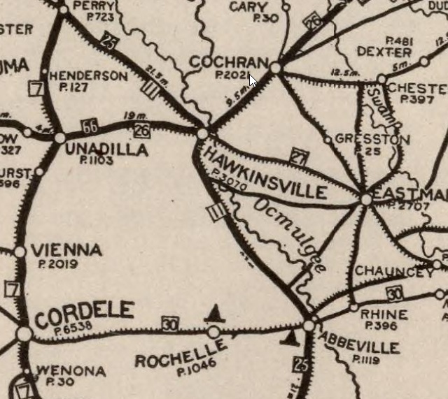 This American auto trail explores a section of the 1920s Dixie Highway from Abbeville to Hawkinsville, Georgia.