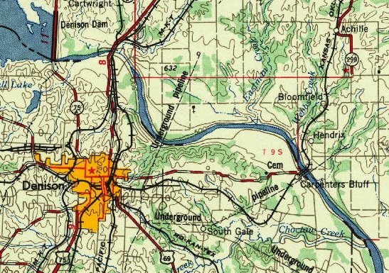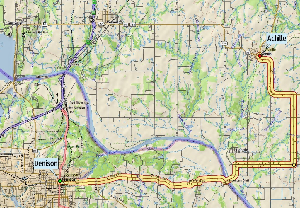 This American auto trail retraces the route of the Missouri, Oklahoma & Gulf Railway from Denison, Texas, to Achille, Oklahoma.