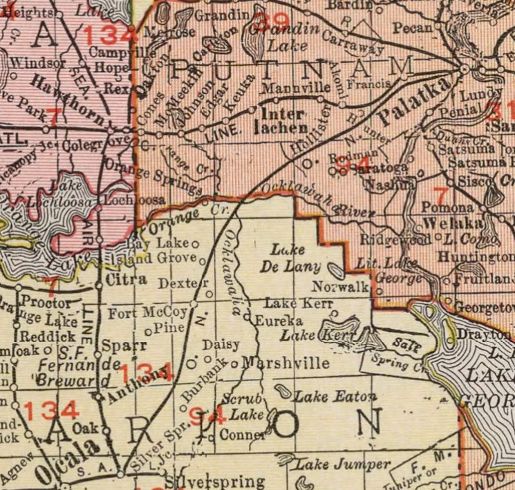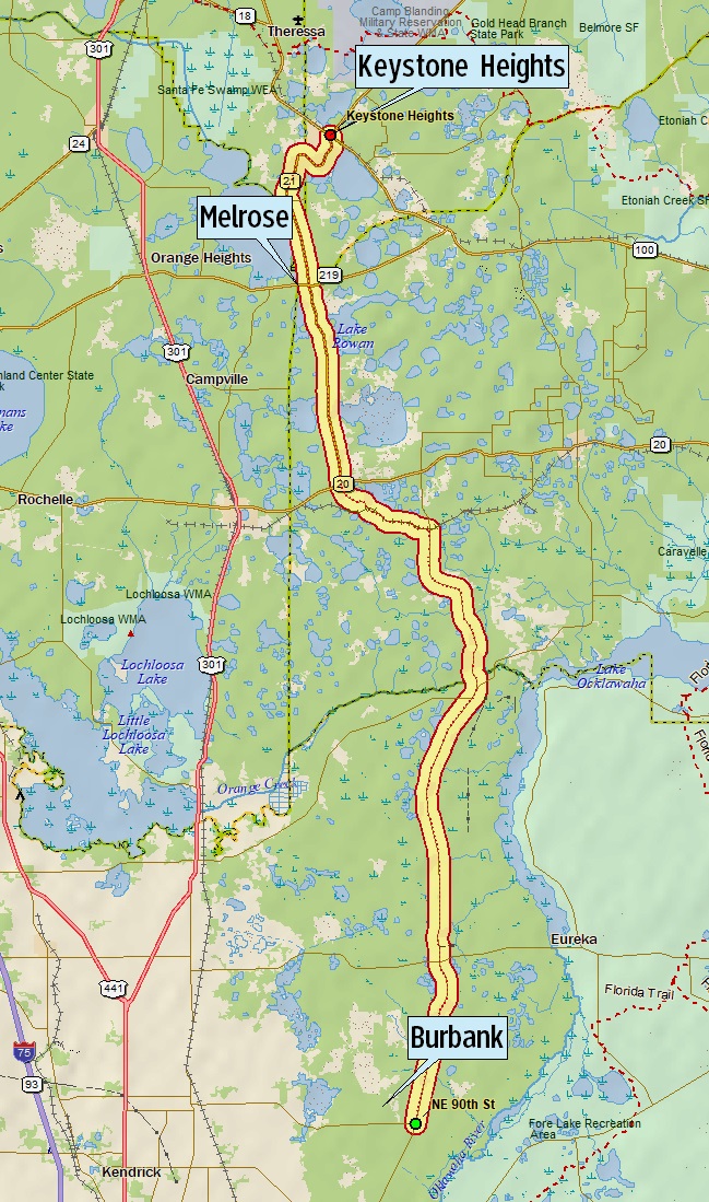 The route follows north from Fort McCoy, along the Ocklawaha River valley, to Melrose and Keystone Heights.