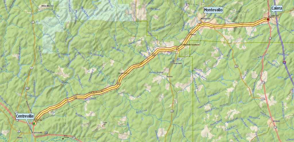 This American auto trail travels from north of Centreville, Alabama, through Montevallo, to Calera.