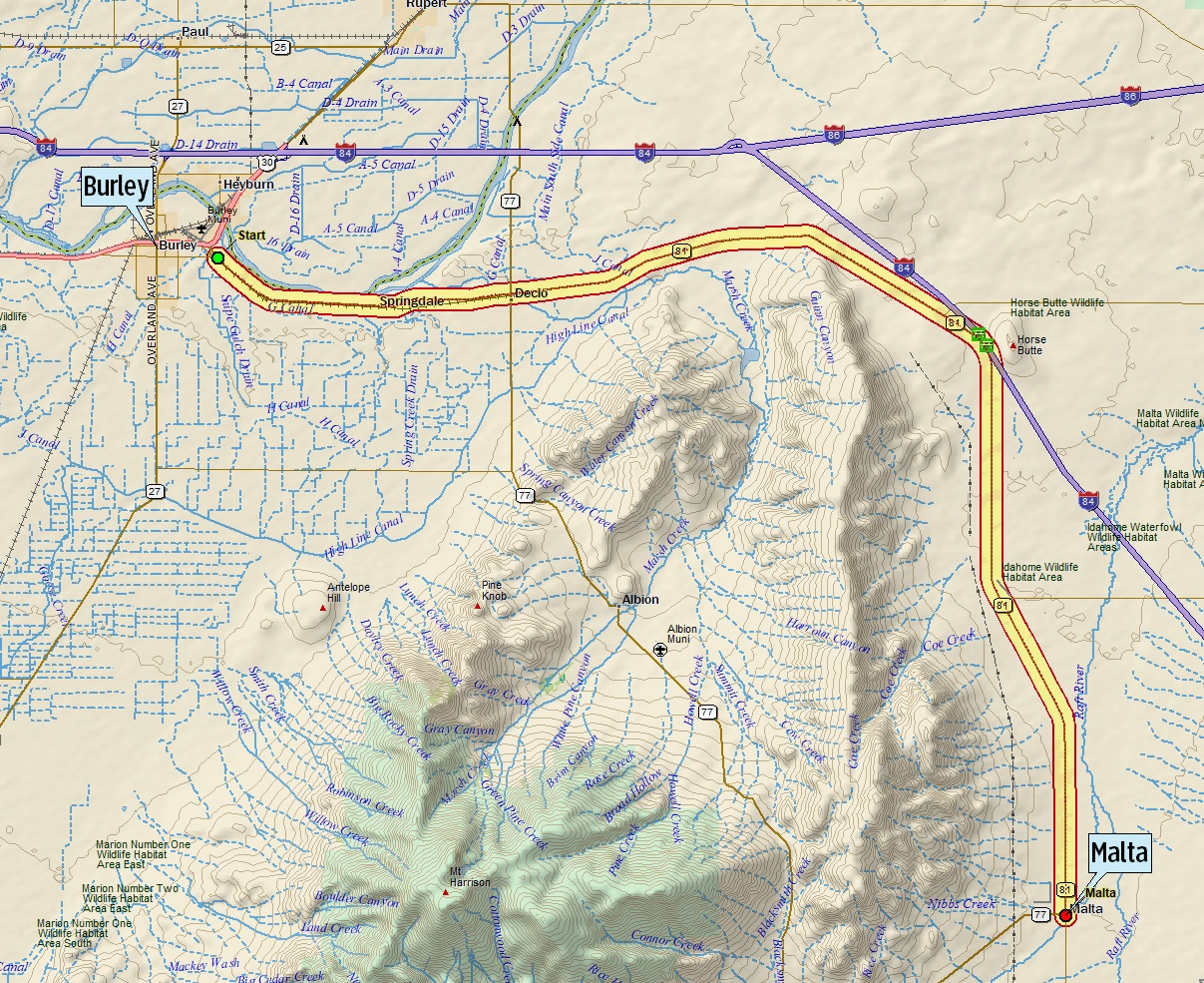 This American auto trail explores the former route of the Oregon Short Line railroad between Burley and Malta, Idaho.