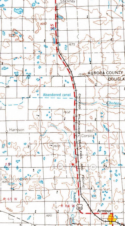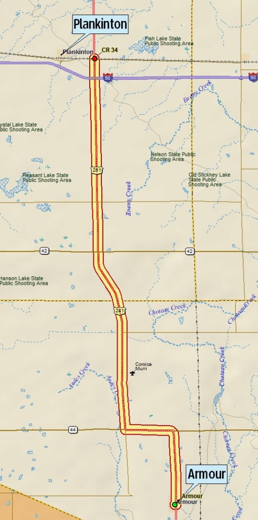 The trail follows U.S. Highway 281 north from Armour to outside Plankinton, South Dakota.