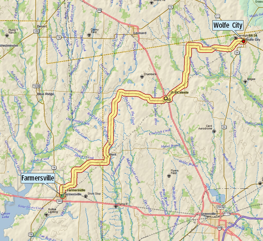 This American auto trail explores the former route of the Gulf, Colorado & Santa Fe Railway, from Farmersville to Wolfe City, Texas.