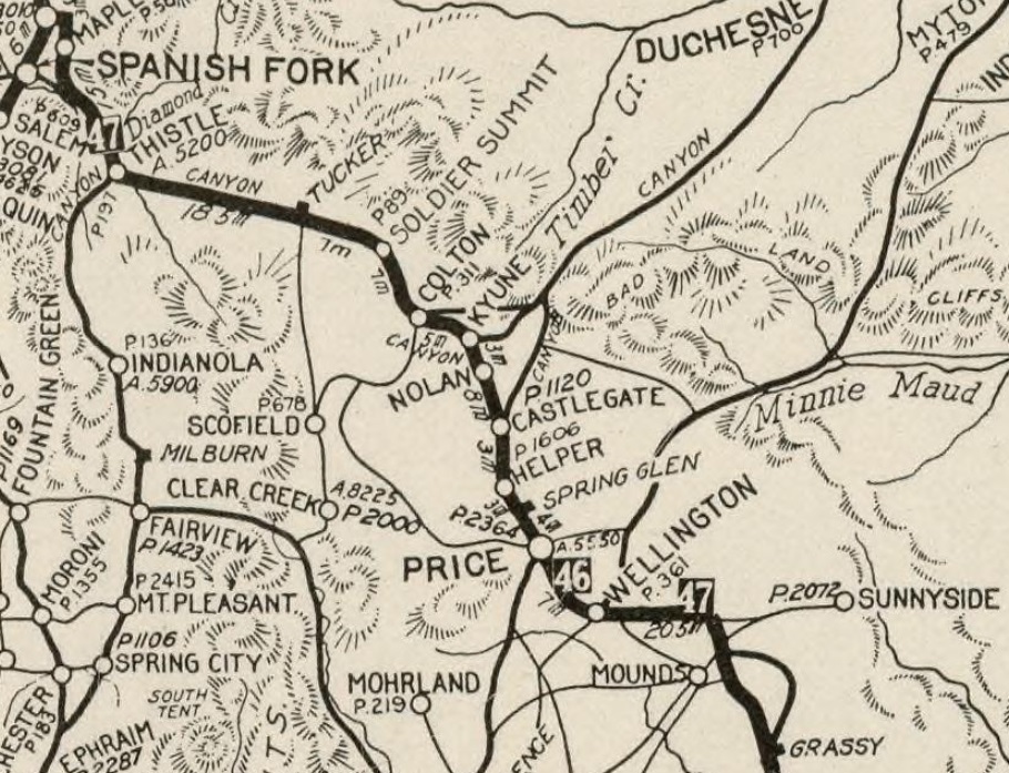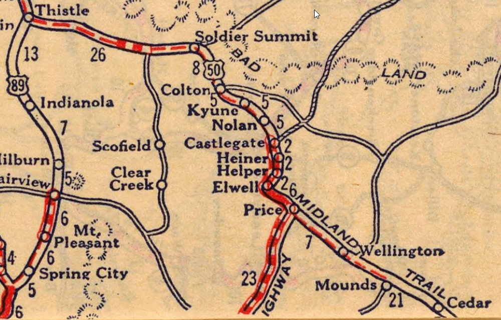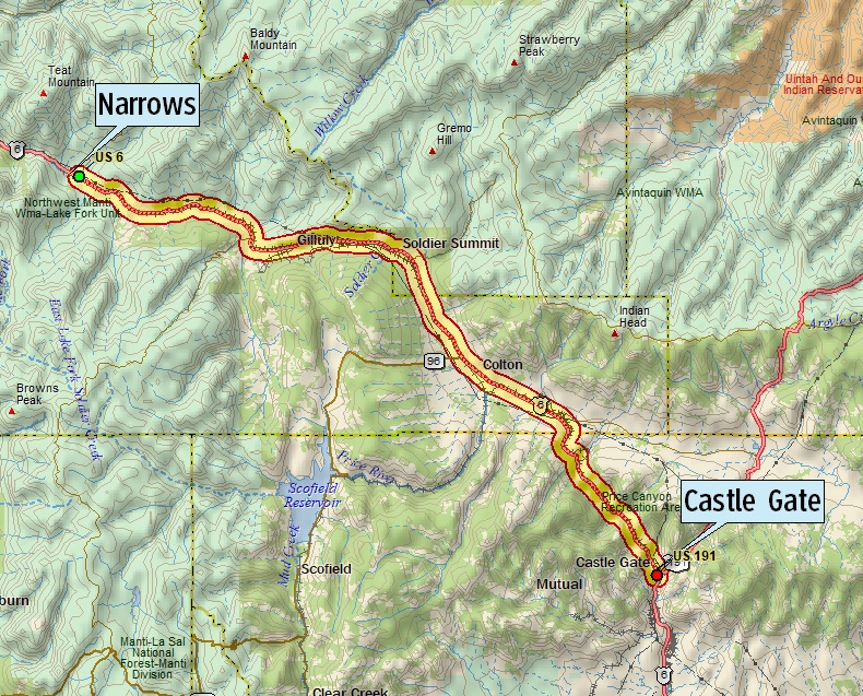 This American auto trail follows U.S. Highway 6 eastbound, from Narrows to Castle Gate, Utah.