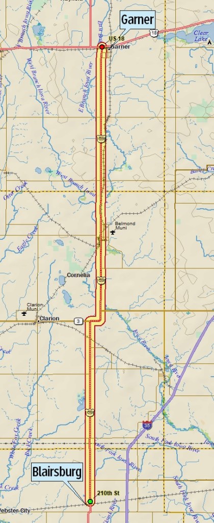 This American auto trail explores a second part of U.S. Highway 69 in northern Iowa, between Blairsburg and Garner.