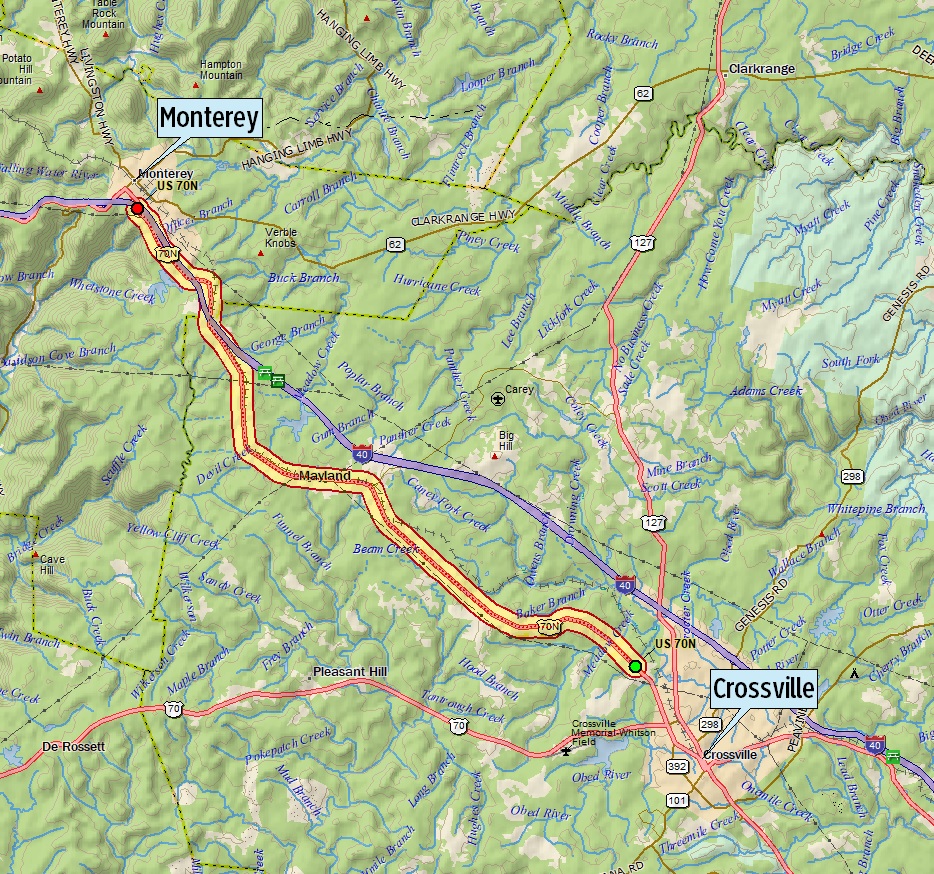 The auto trail begins in Crossville, Tennessee, and ends at the town of Monterey.