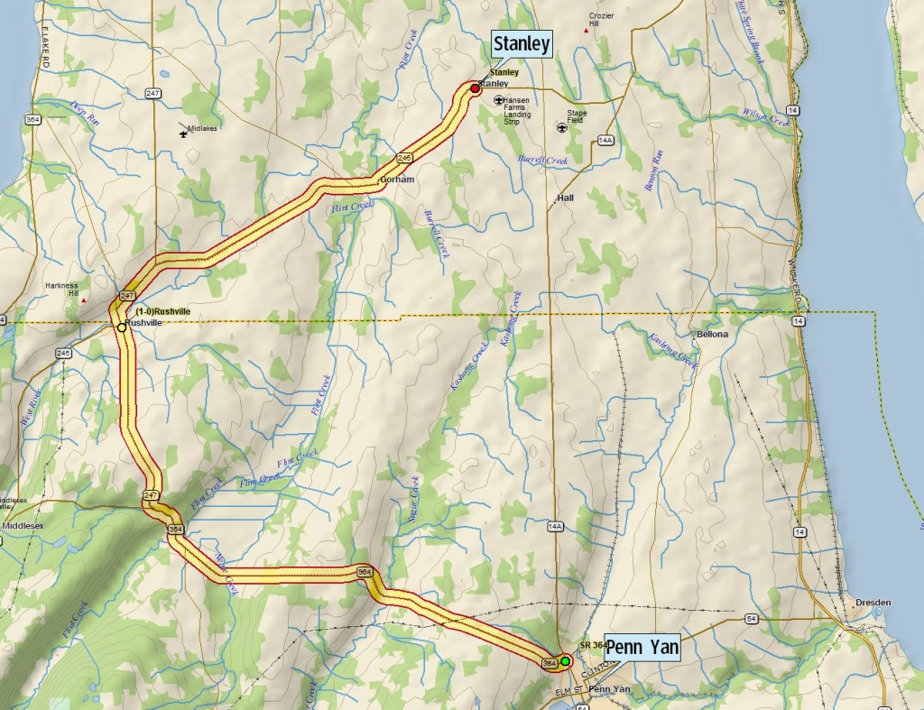 The route begins in Penn Yan in Yates County and ends in Ontario County’s town of Stanley.
