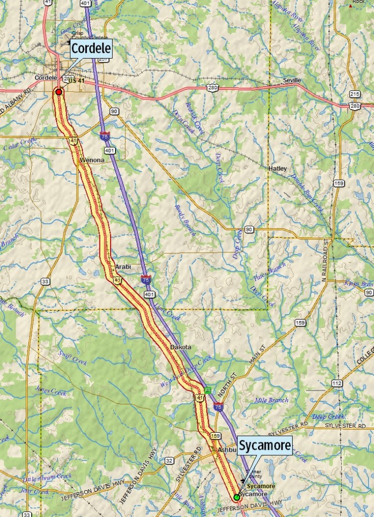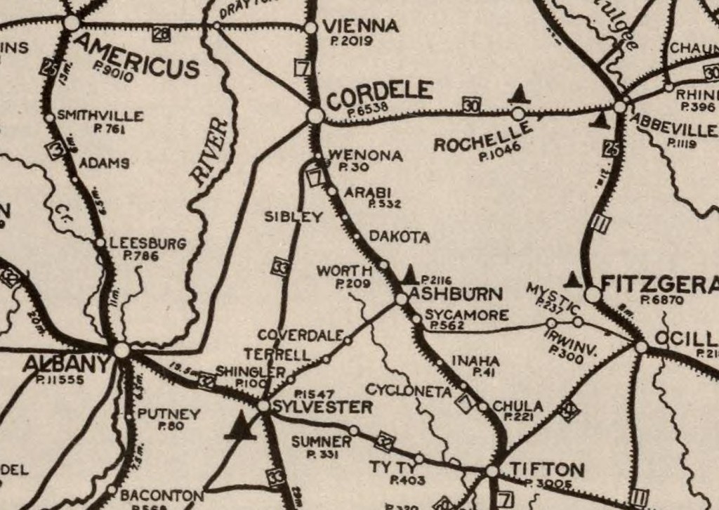 This American auto trail closely follows the former tracks of the Georgia Southern & Florida Railroad, from Sycamore to Cordele, Georgia.
