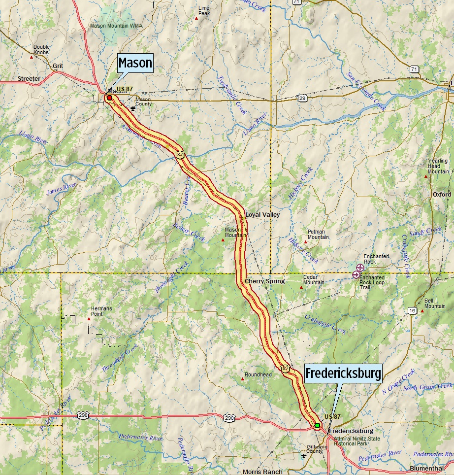 The auto trail begins at Fredericksburg in Gillespie County and ends at Mason in the county of the same name.