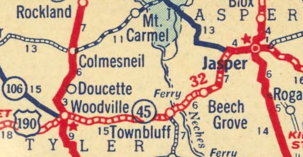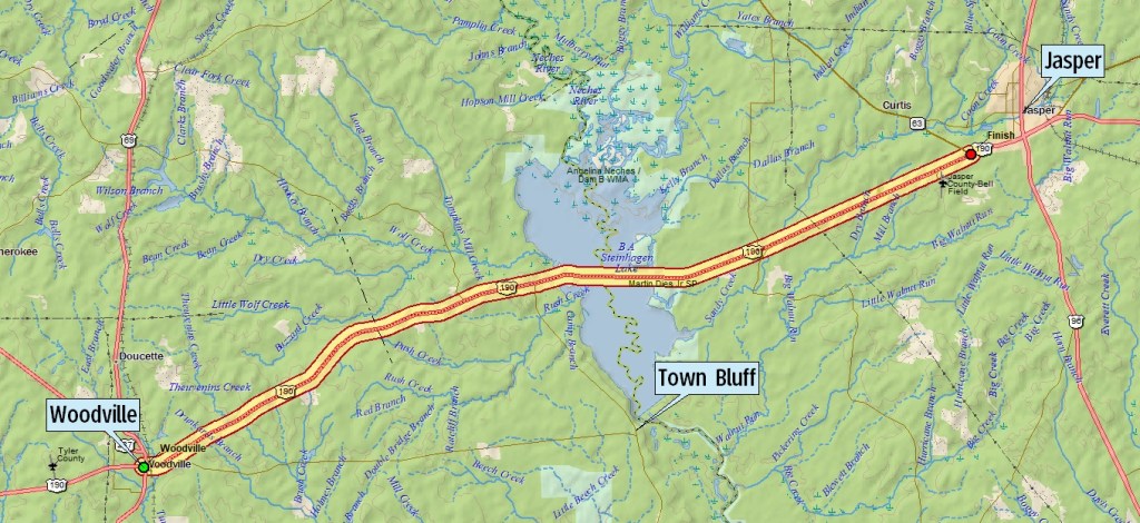 The route crosses the Neches River while passing through the Texas Forest Trail region.