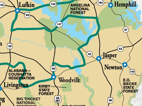 This American auto trail explores portions of Tyler and Jasper counties, between towns of Woodville and Jasper.