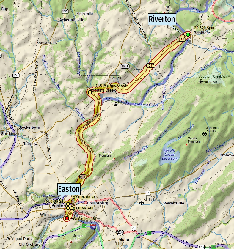 This American auto trail explores along the west bank of the Delaware River, between Riverton and Easton, Pennsylvania.