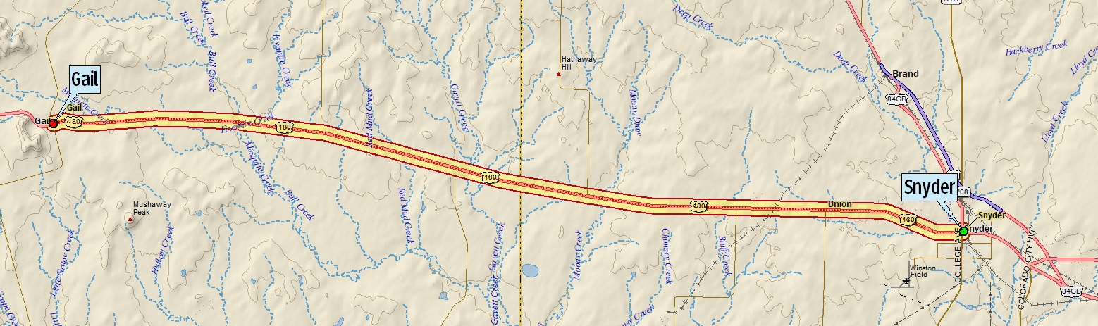 The route follows U.S. Highway 180 west from Snyder to Gail, Texas.