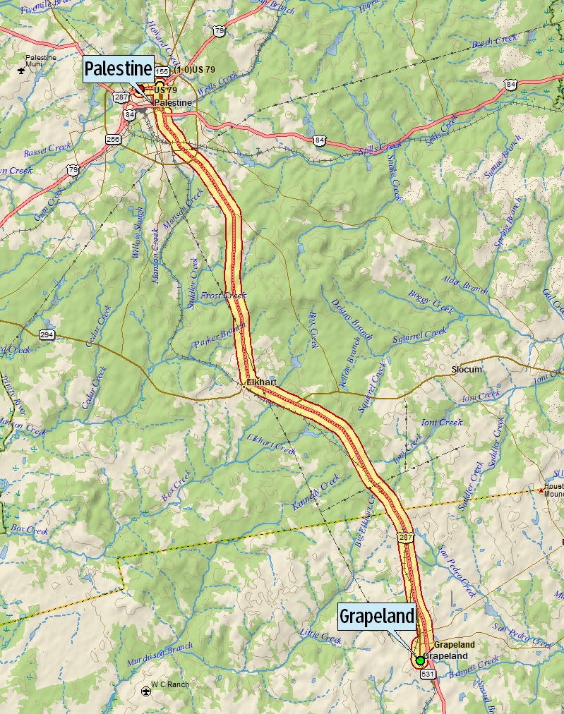 This American auto trail explores along U.S. Highway 287 and Texas State Highway 19, from Grapeland to Palestine.