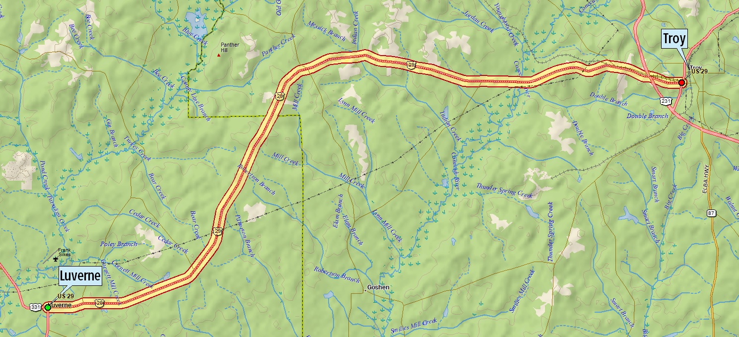 The route ends in Troy, crossing from Crenshaw County to Pike County.