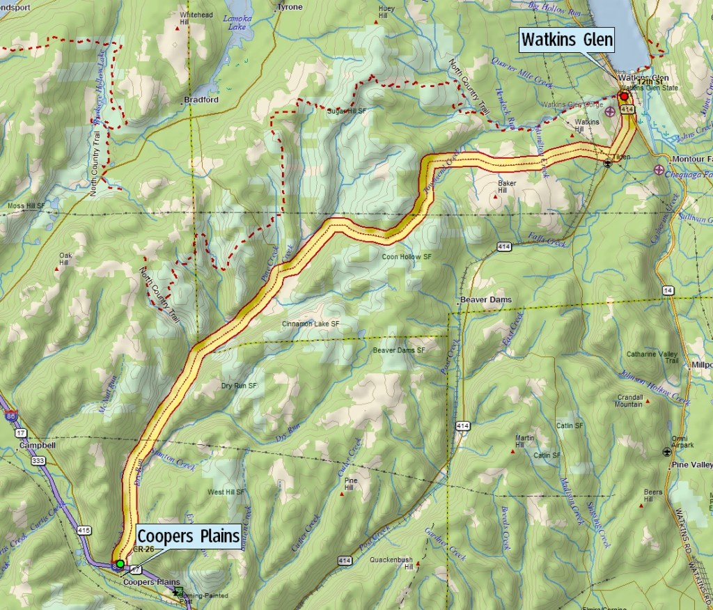 The route travels from Coopers Plain on the Cohocton River, up the valley of Meads Creek, to Watkins Glen.
