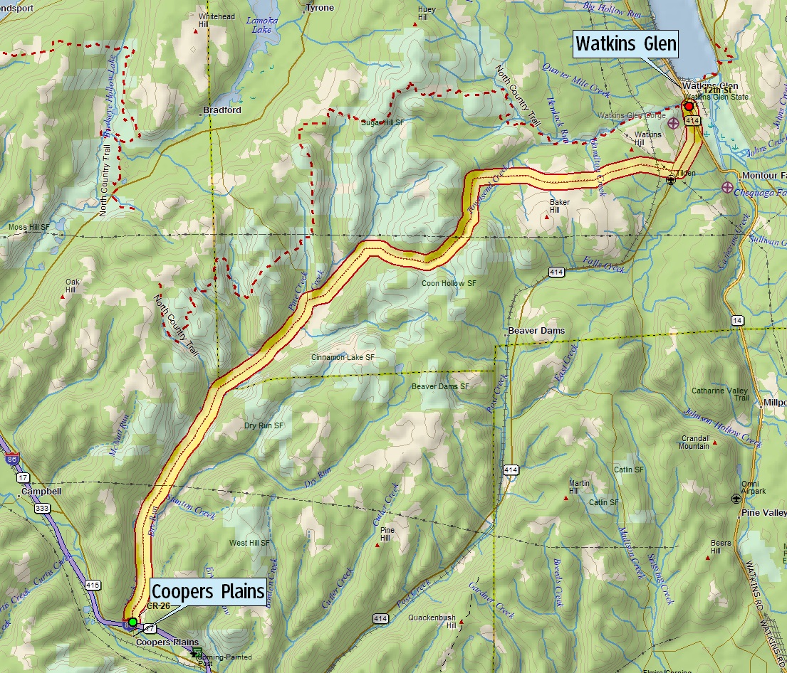 The route travels from Coopers Plain on the Cohocton River, up the valley of Meads Creek, to Watkins Glen.