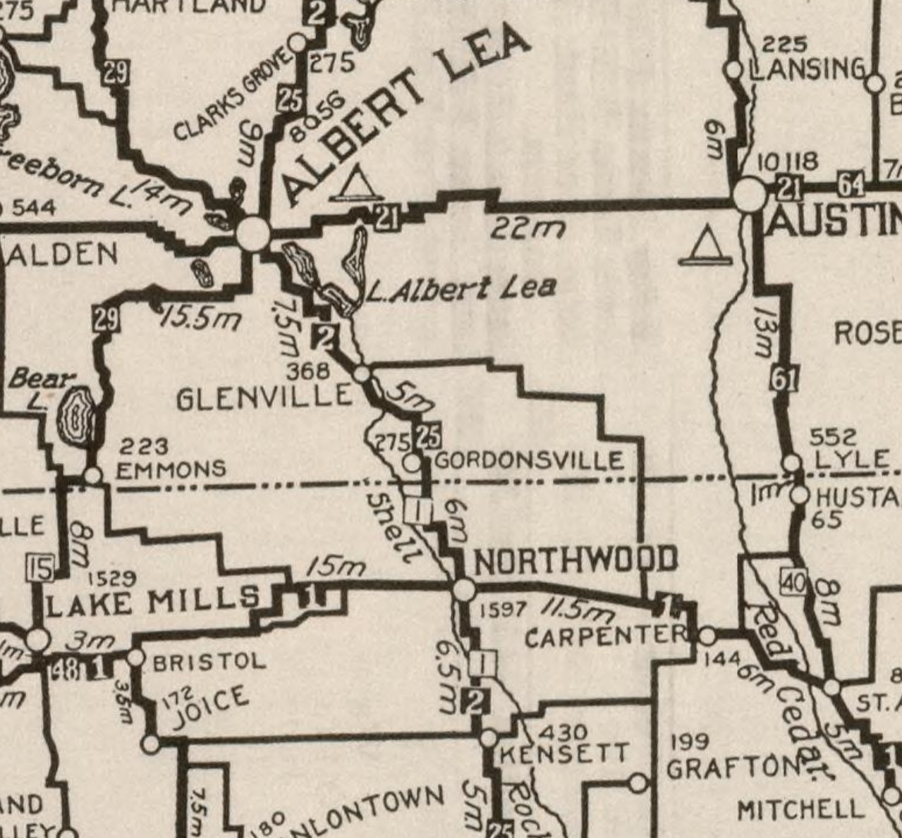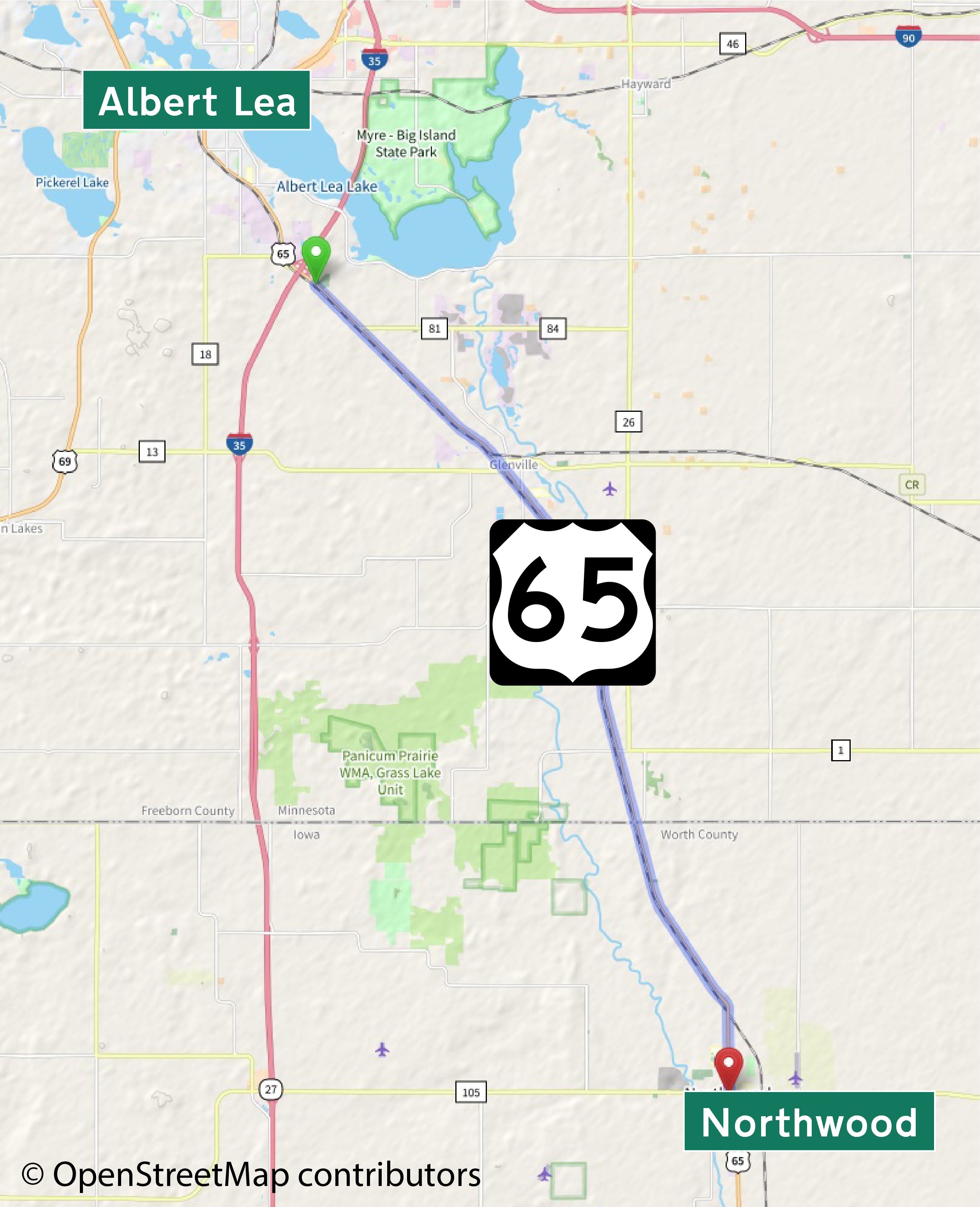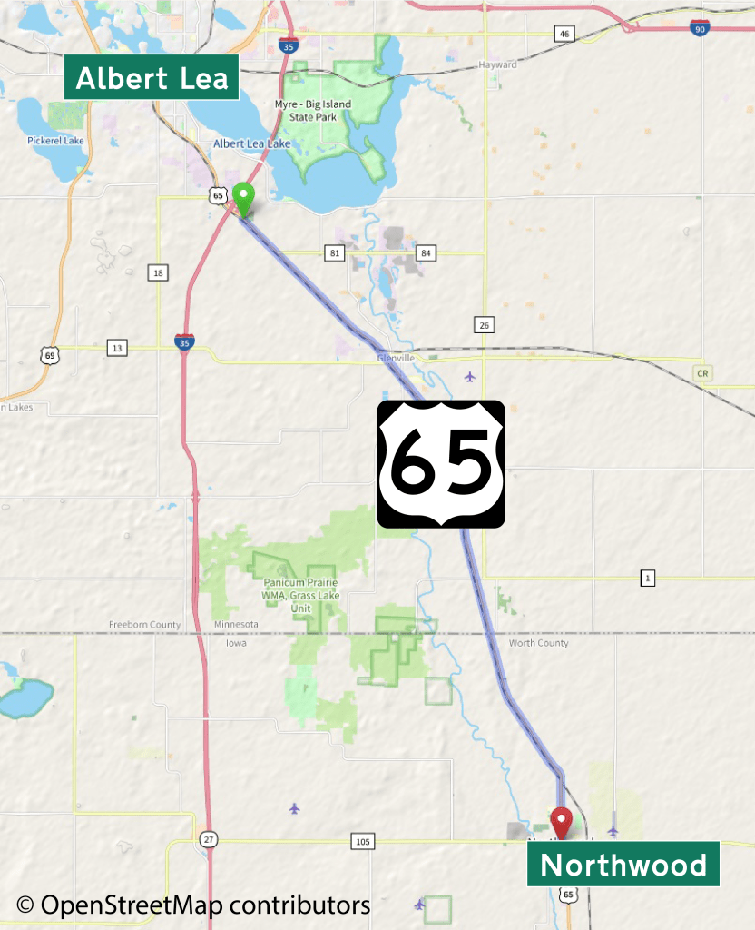 This American auto trail follow the 1910s Jefferson Highway from south of Albert Lea, Minnesota, to Northwood, Iowa.